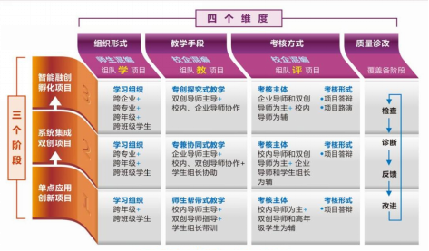 一是教学实施项目化。从教学组织形式、教学手段等4个维度,按需组环境、编团队,运用项目化、信息化等教学手段,以“师生混编组队学项目、校企混编组队教项目、校企混编组队评项目”为特色,以“三段四维”教学实施过程标准化提升课堂教学有效性。