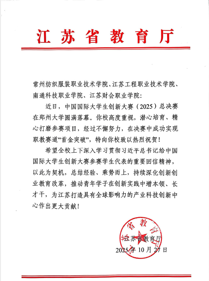 近日,中国国际大学生创新大赛(2025)总决赛在郑州大学圆满落幕。常州纺织服装职业技术学院凭借对参赛工作的高度重视、对项目的潜心培育与精心打磨,在全国众多高校的激烈角逐中脱颖而出,成功实现职教赛道“首金突破”,为江苏省职业教育创新发展写下亮眼一笔,获江苏省教育厅专门发函祝贺。
